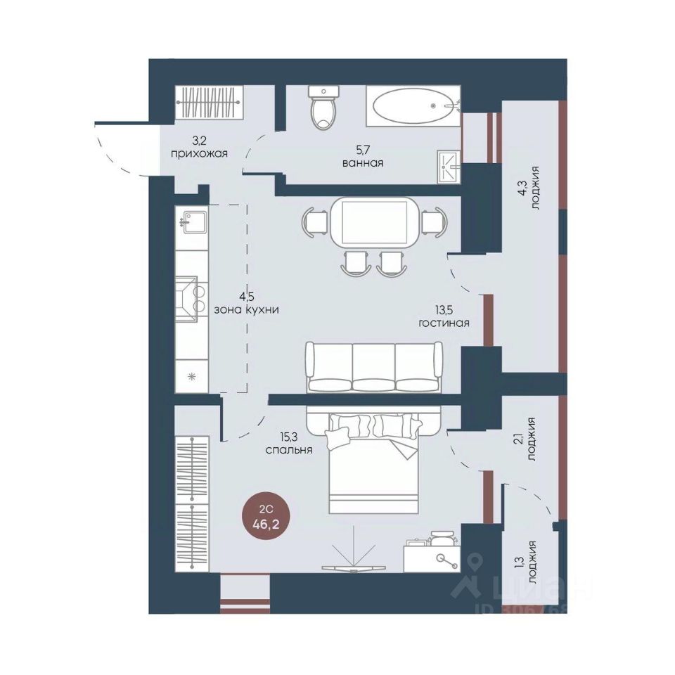 Общая площадь46,2 м2