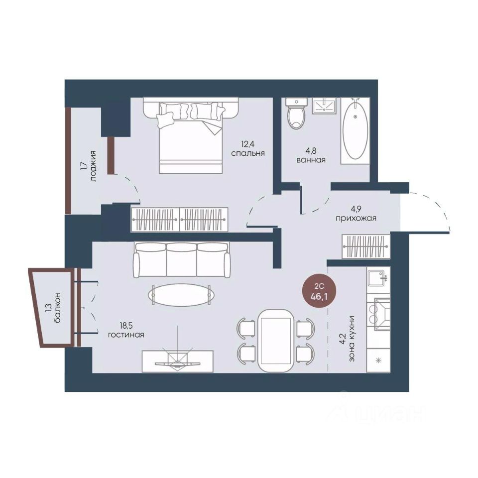 Общая площадь46,1 м2