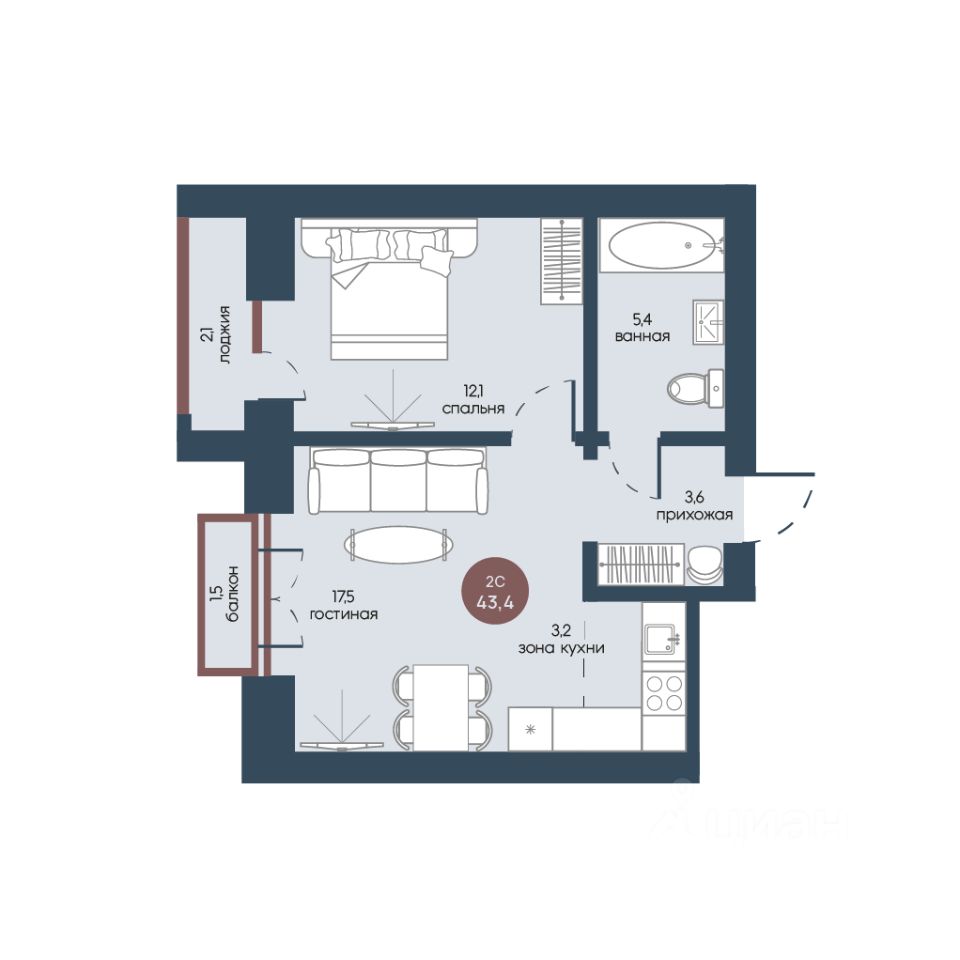 Общая площадь43,4 м2