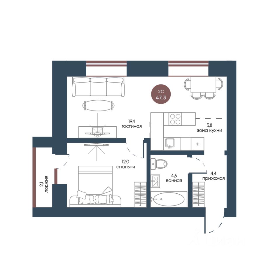 Общая площадь47,3 м2