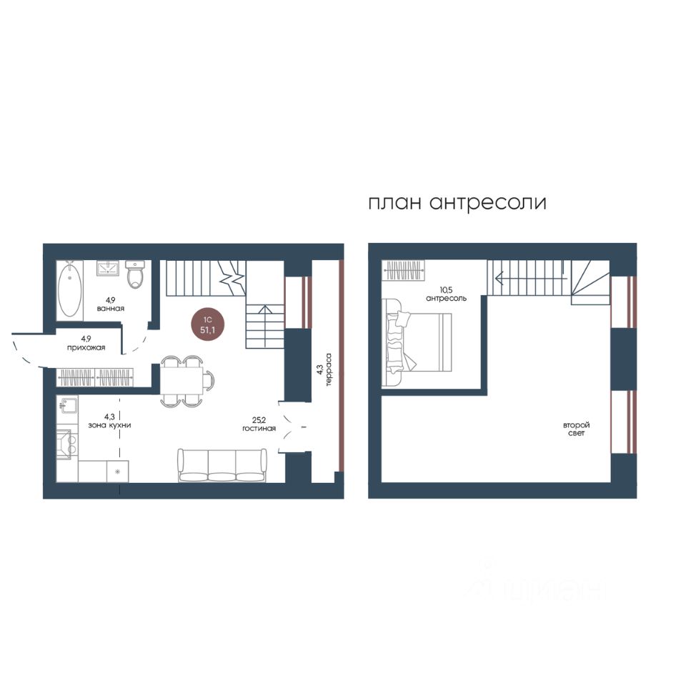 Общая площадь51,1 м2