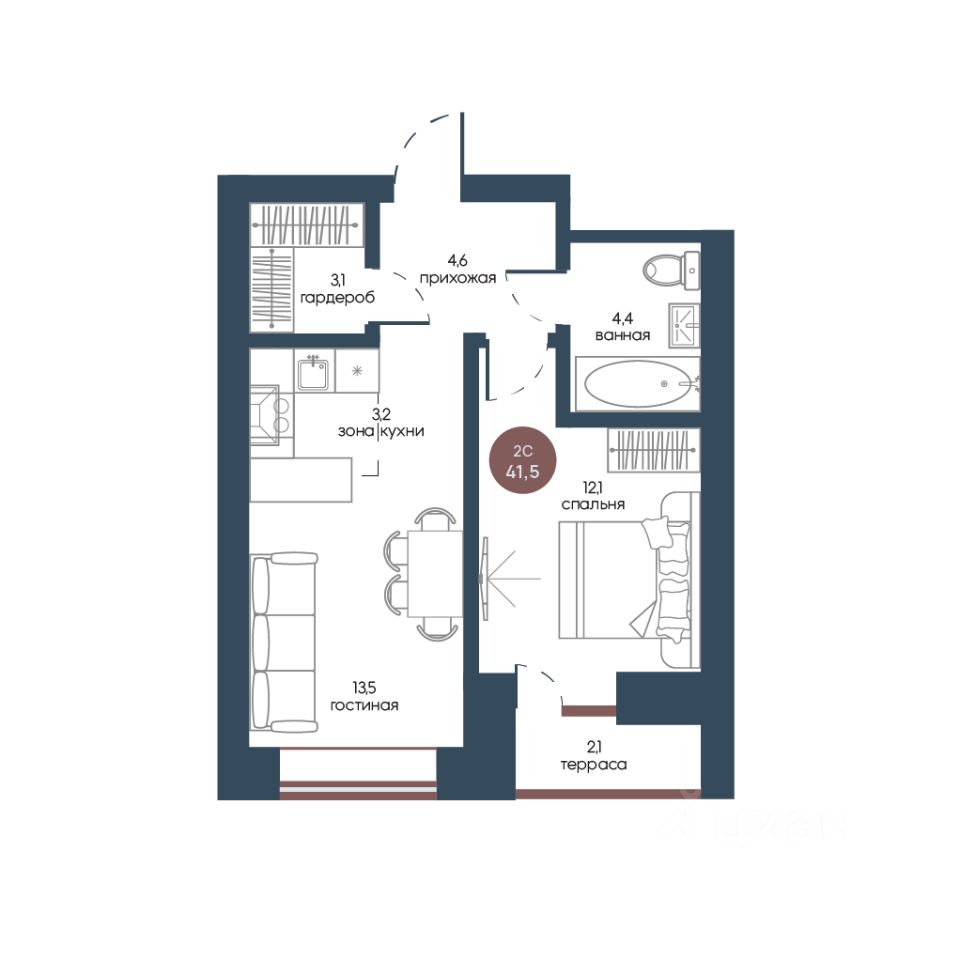 Общая площадь41,5 м2