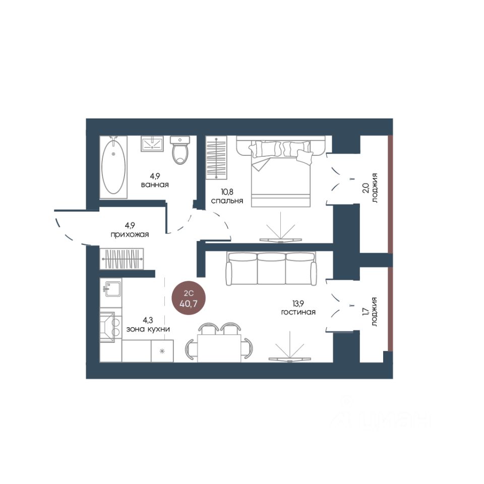 Общая площадь40,7 м2