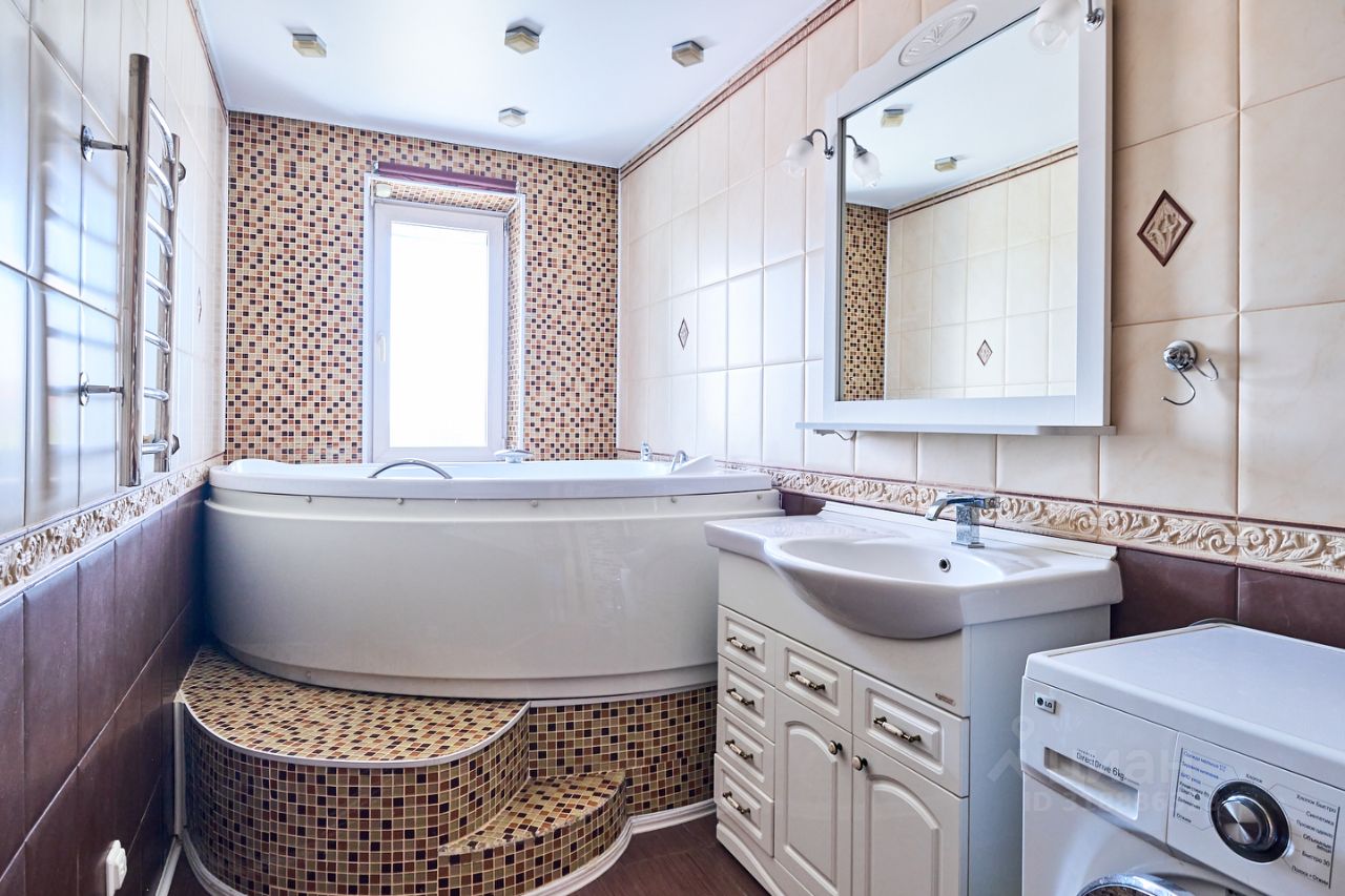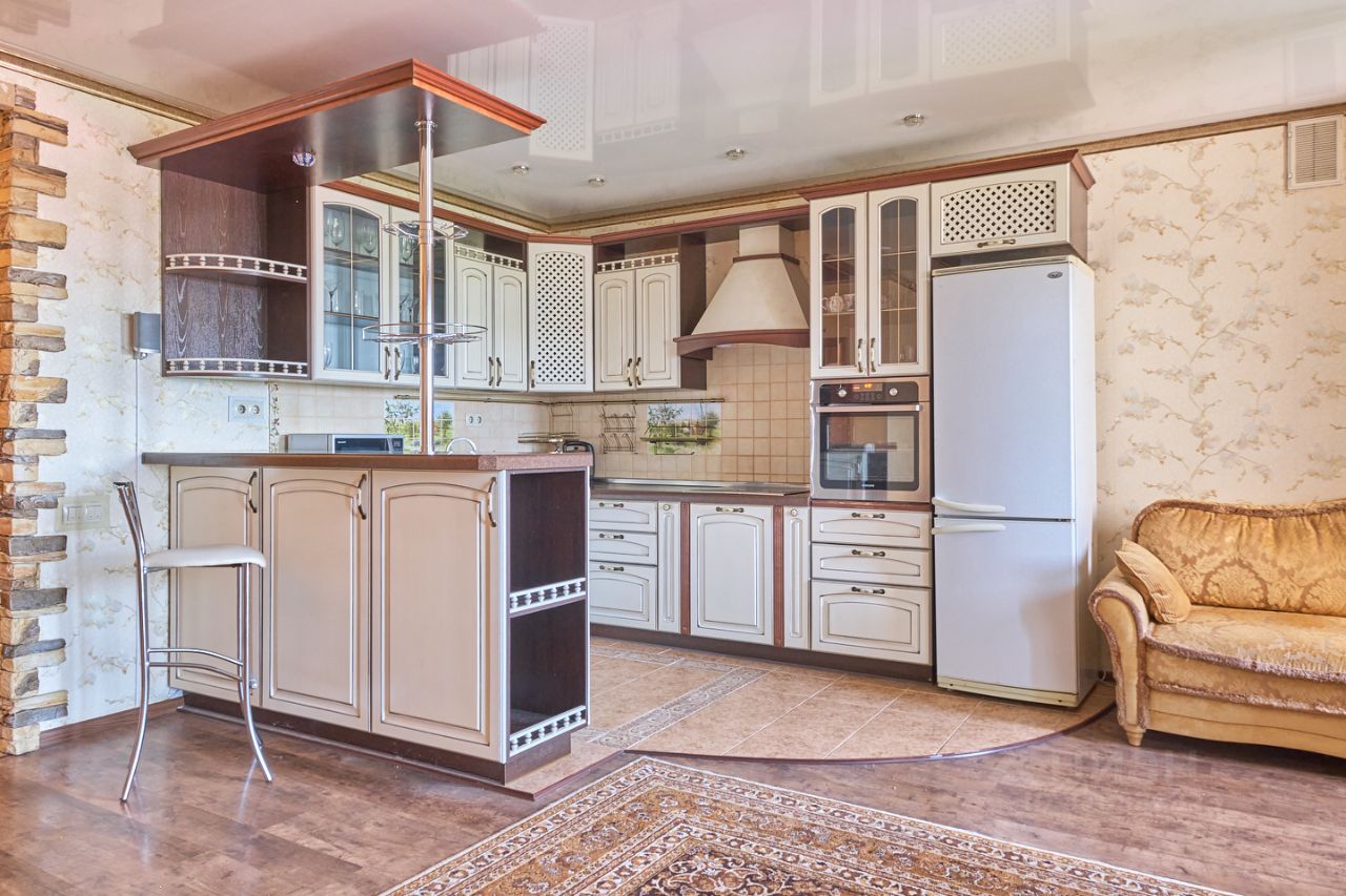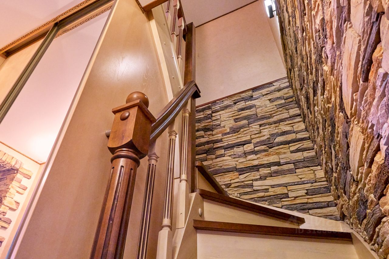 Как живётся здесь? Утром вы работаете в кабинете на застеклённой лоджии с видом на стадион, днём дети играют в комнате с восточным солнцем, а вечером вся семья собирается за большим столом на кухне. Гости удивляются классической гармонии интерьера: золотистый диван в стиле барокко, кафель с орнаментом, каменная отделка стен у лестницы.