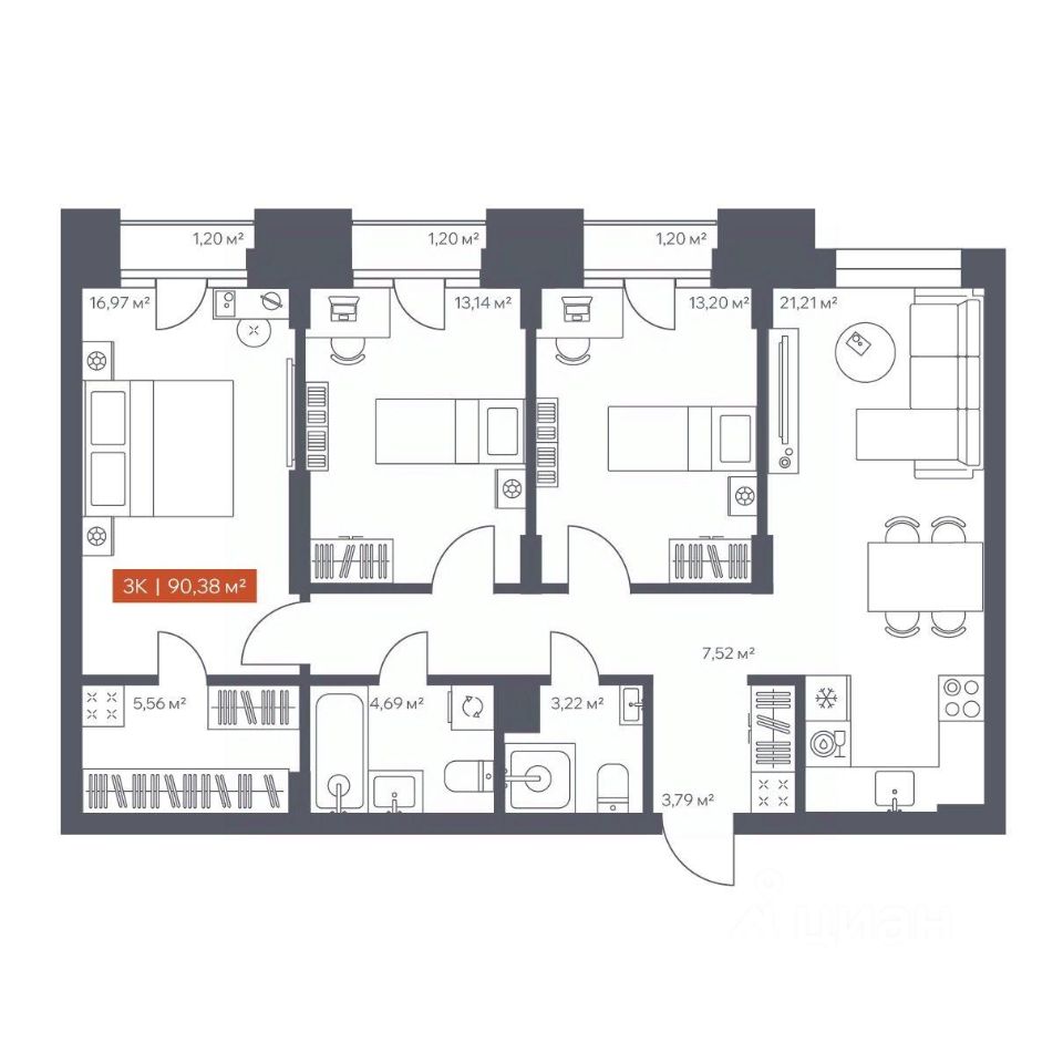 Общая площадь90,38 м2