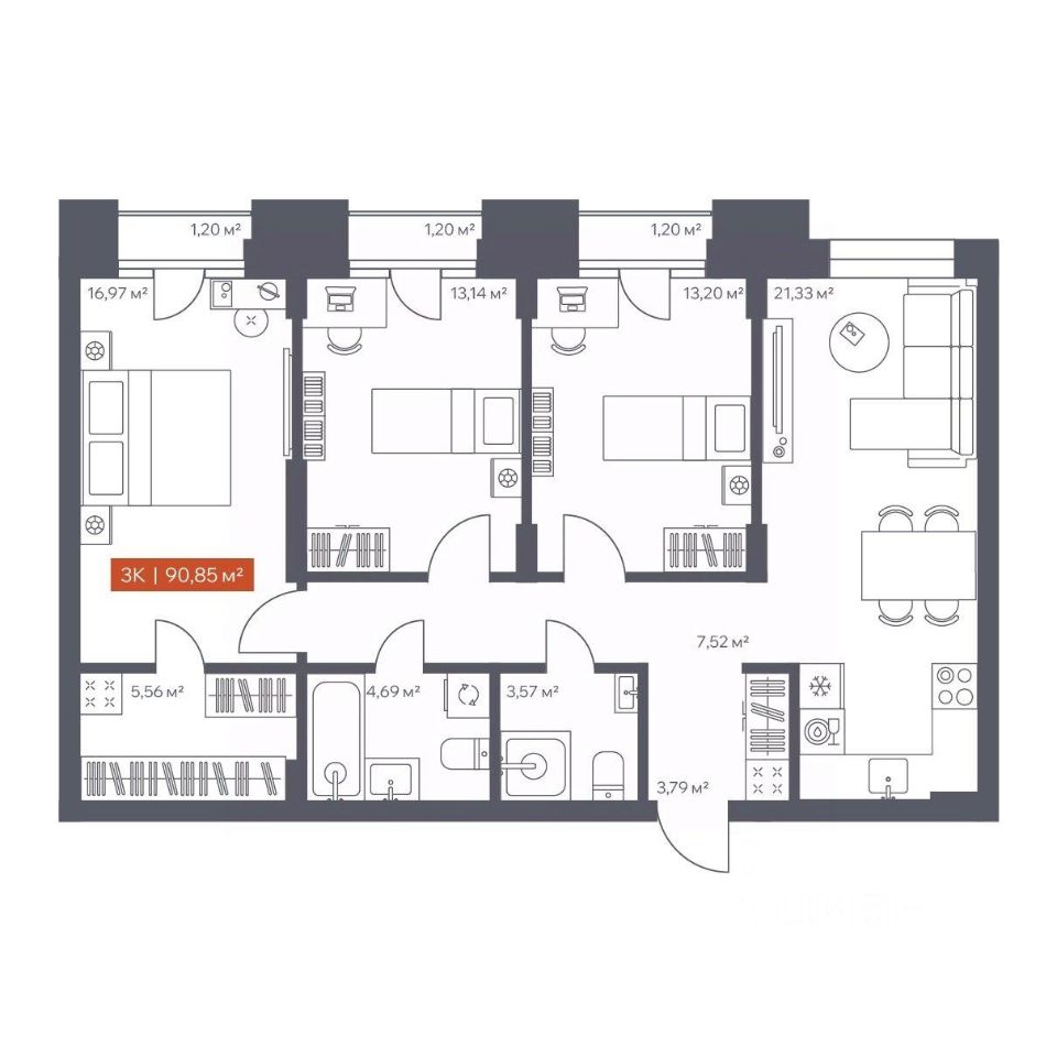 Общая площадь90,85 м2