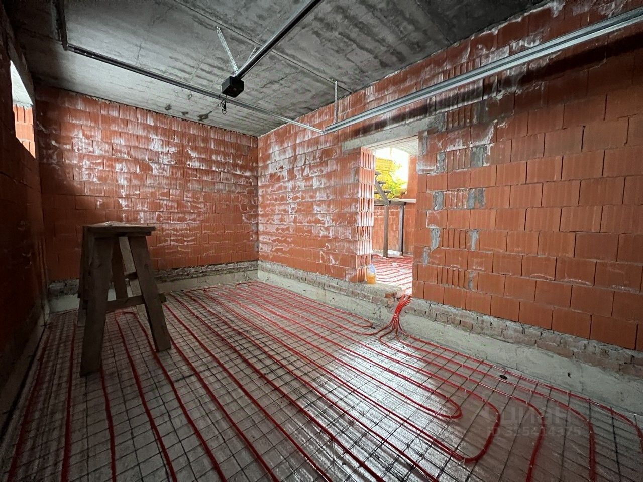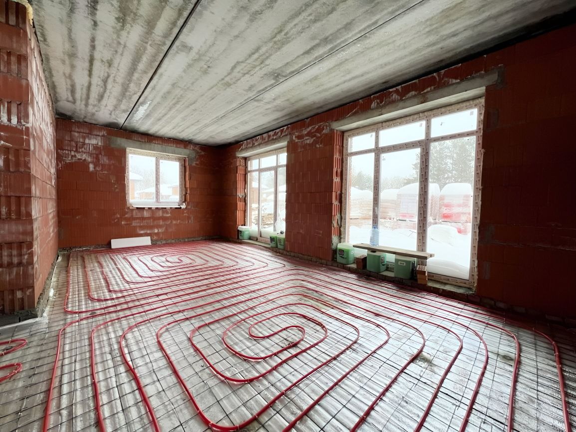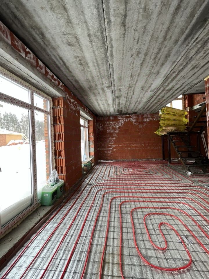 Выполнена разводка теплого пола по всему контуру дома, установлена основательная лестница.