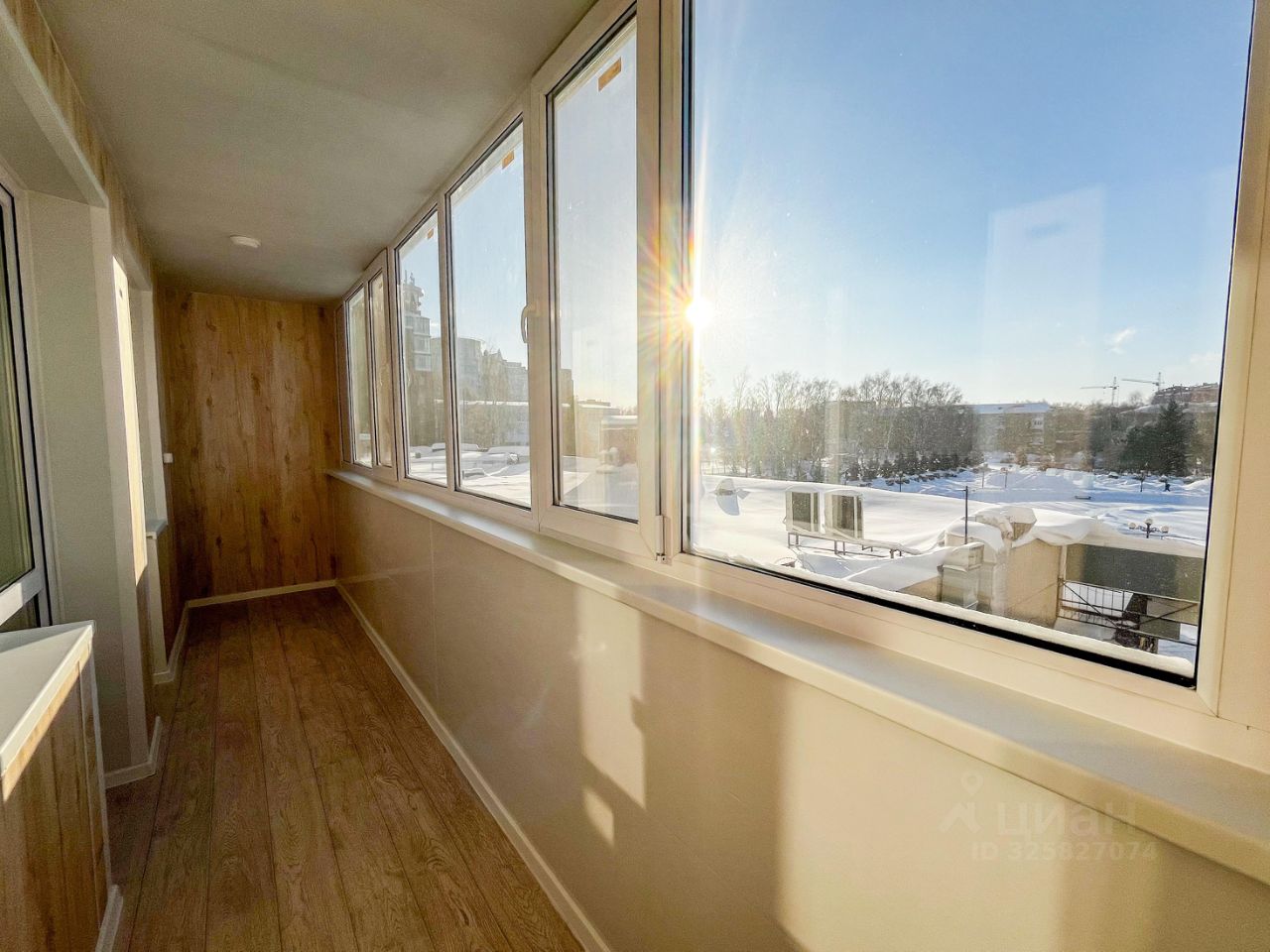 Балкон с видом на фонтан с двумя выходами в квартиру, новые стеклопакеты, выполнена качественная внутрення отделка.