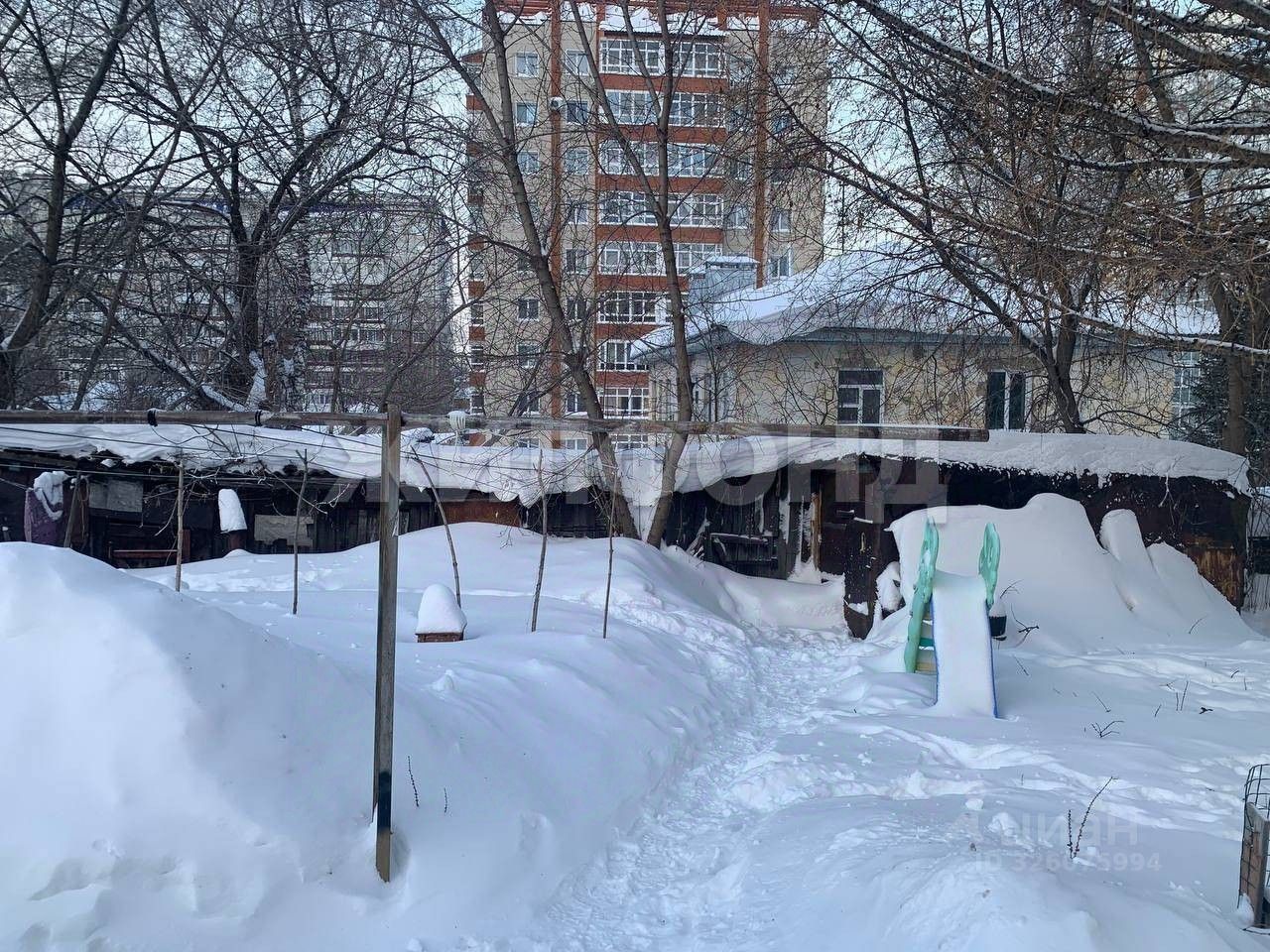 Во дворе к квартире прилагается: железный гараж, сарай, погреб.