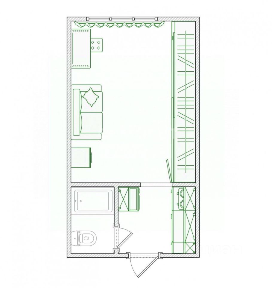 В комнате предусмотрено максимально просторное место для хранения. Здесь легко разместятся раскладной диван, рабочий стол, а также есть место для обеденного стола. По желанию вместо дивана можно поставить кровать — зависит от ваших предпочтений.